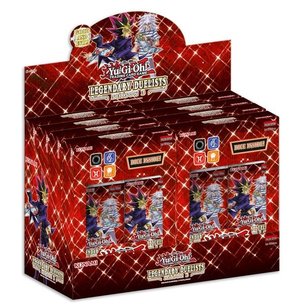 Featuring cards introduced in Legendary Duelists: Immortal Destiny and Legendary Duelists: Magical Hero, Legendary Duelists: Season 3 is the go-to set for fans of Dark Magician, HERO, Synchrons, and more!Each box of Legendary Duelists: Season 3 includes 1 Secret Rare - a rarity that wasn't available in Immortal Destiny or Magical Hero - as well as 6 Ultra Rares. For this release, because it has a double dose of Jaden, the Ultra Rares will come in the colours of the 3 Duel Academy dorms: 2 red Ultra Rares for Slifer Red, 2 blue Ultra Rares for Obelisk Blue, and 2 standard Ultra Rares for Ra Yellow.And as a special bonus, each Legendary Duelists: Season 3 box will also contain one of several collectible dice featuring famous monsters or symbols associated with Yugi, Jaden, and Yusei.Each Legendary Duelists: Season 3 display box comes with 8 mini boxes and each mini box contains a total of: