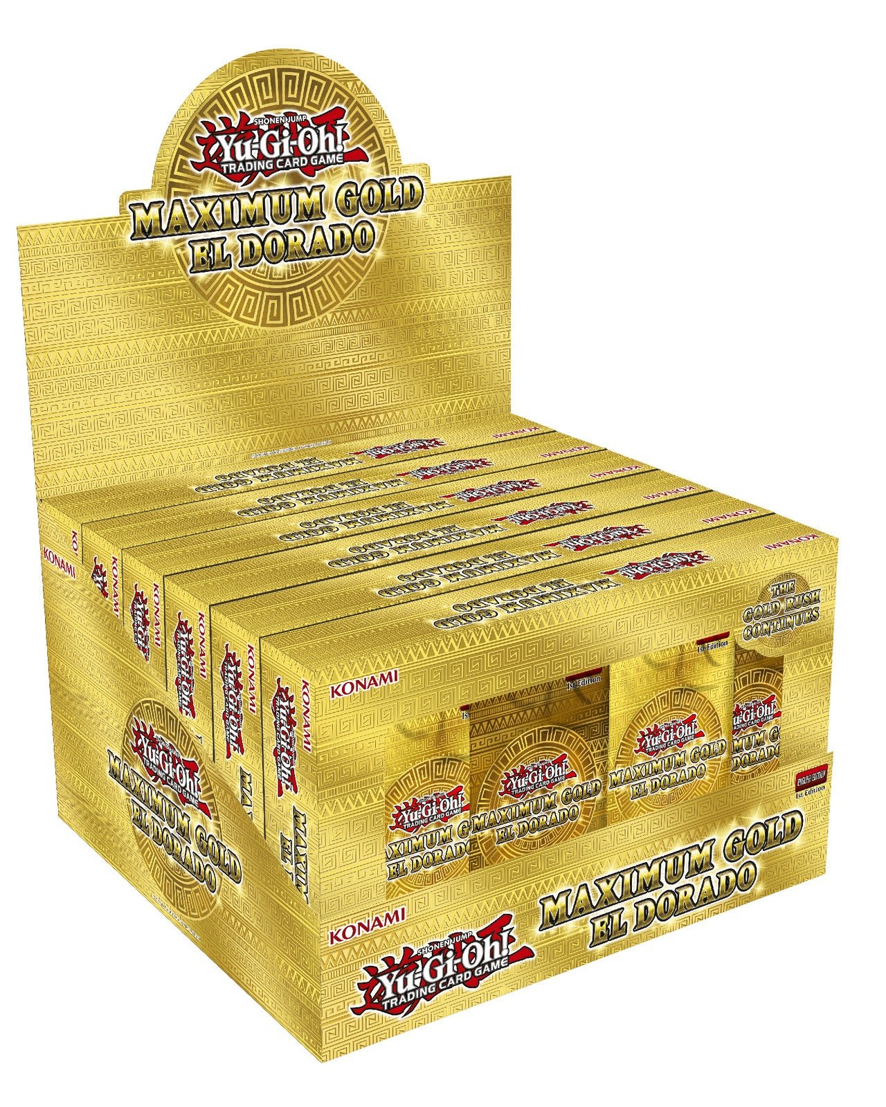 Each Yu-Gi-Oh - Maximum Gold El Dorado booster box includes 6 mini boxes. Each mini box contains 4 Booster Packs with 7 cards each: 2 Premium Gold Rares and 5 gold-letter Rares.